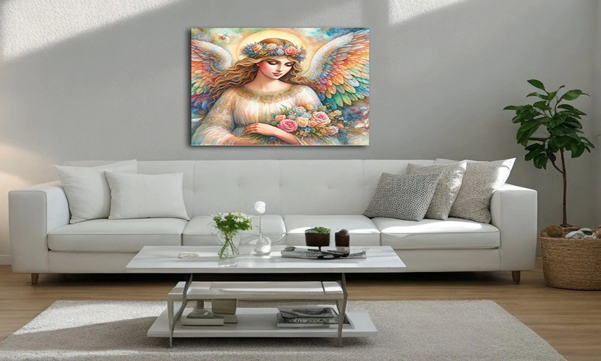 Ángel con alas multicolor y detalles florales en una composición luminosa y delicada, ideal para aportar calma, armonía y un toque espiritual a espacios como sala, comedor o habitación. Sus tonos suaves y contrastes coloridos crean una atmósfera cálida y elegante.