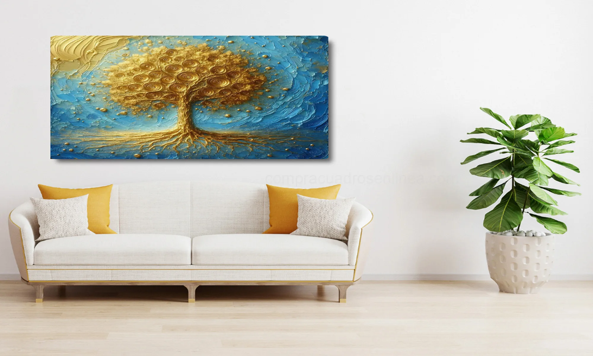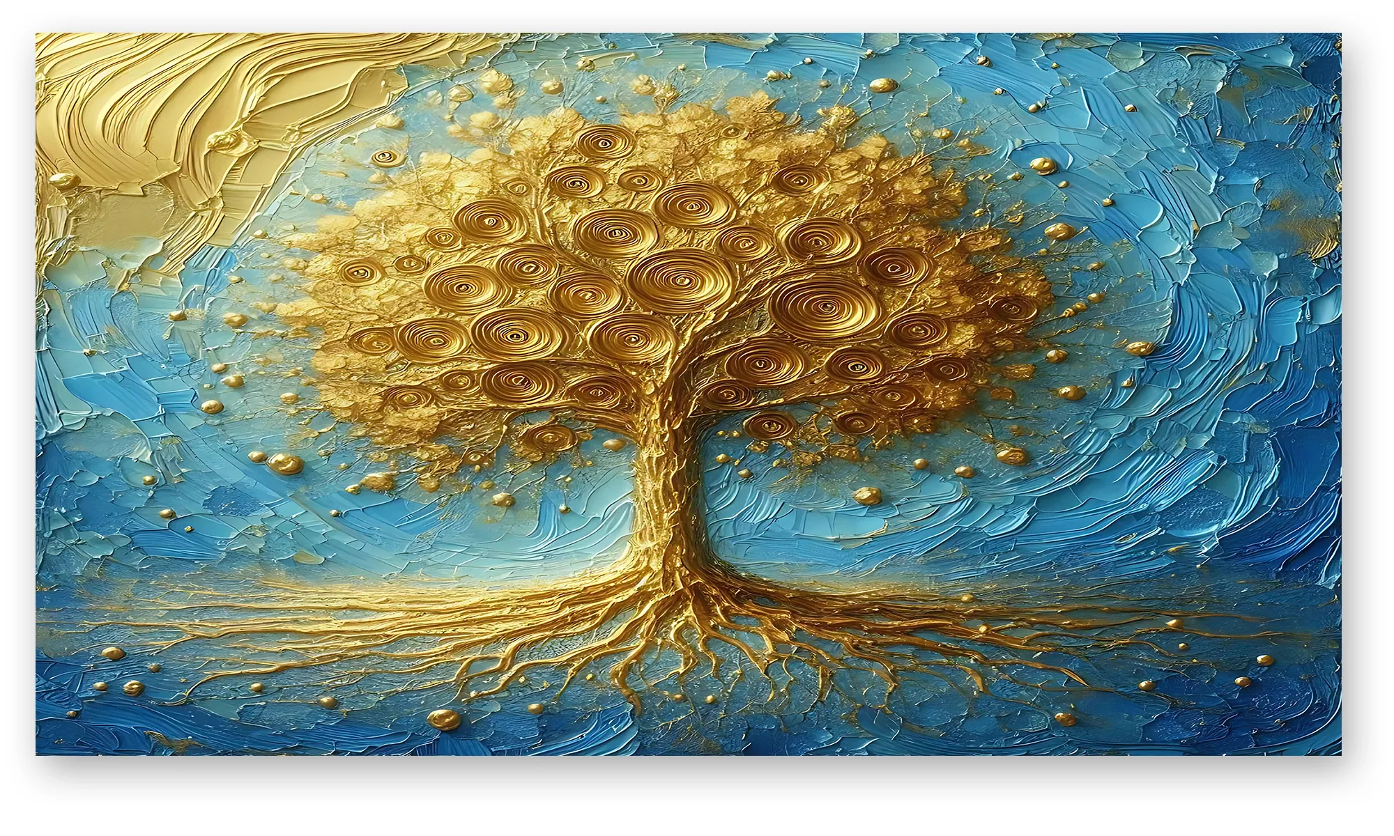 Este cuadro árbol decorativo presenta un árbol dorado de textura rica y detalles circulares que evocan equilibrio, calma y crecimiento.