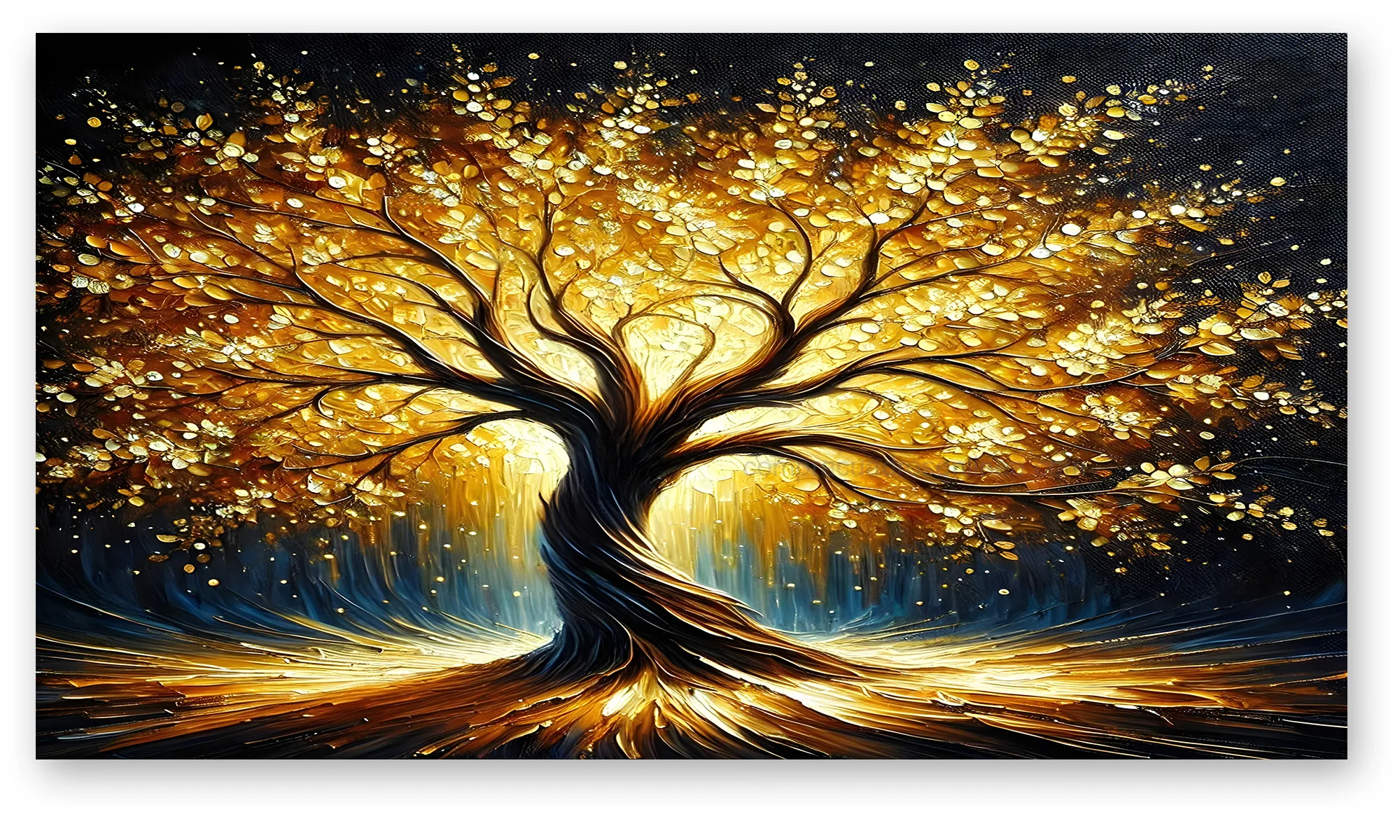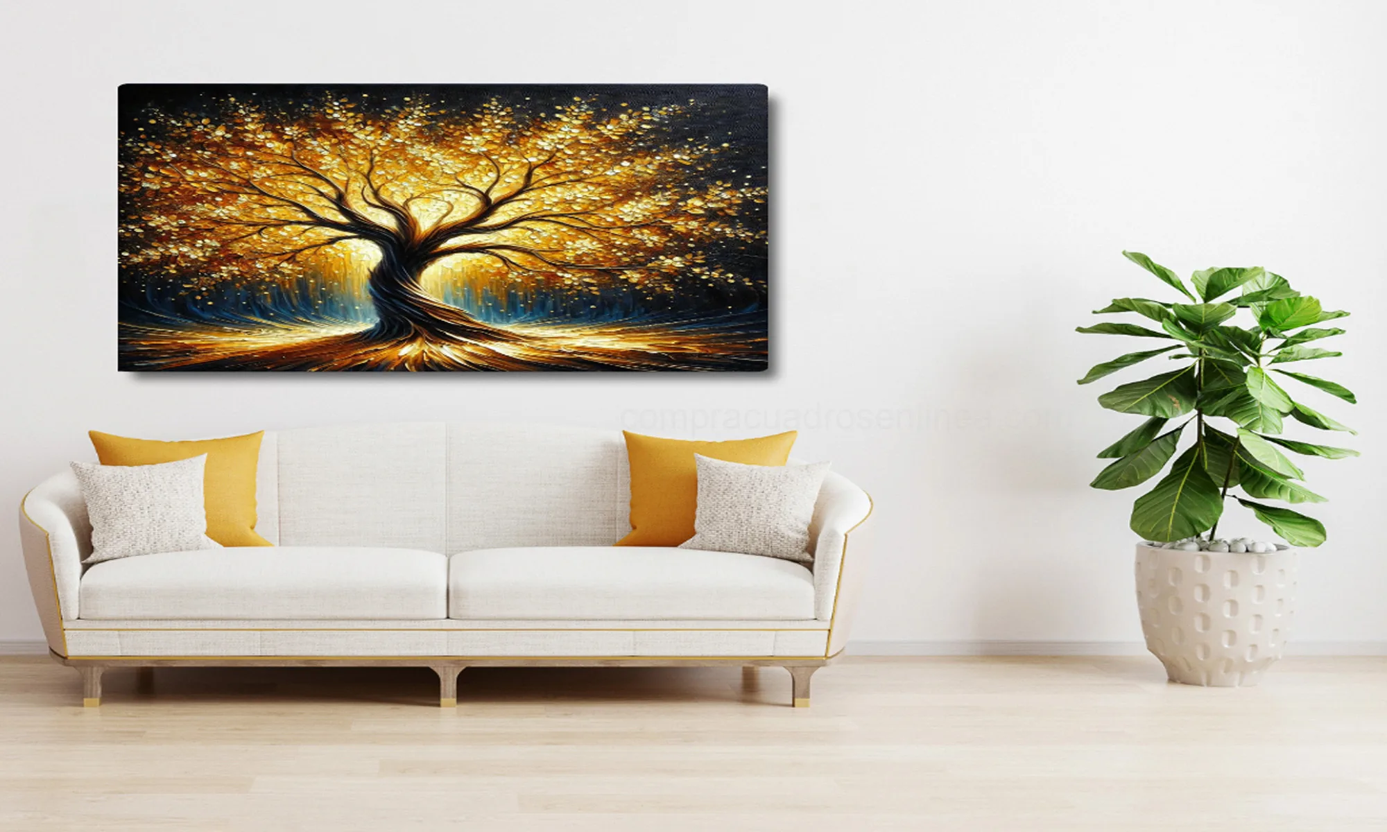 Árbol dorado brillante sobre fondo oscuro con un estilo moderno y sofisticado, ideal para aportar elegancia y carácter a espacios como sala, comedor o habitación. Su contraste marcado crea un punto focal de alto impacto visual.