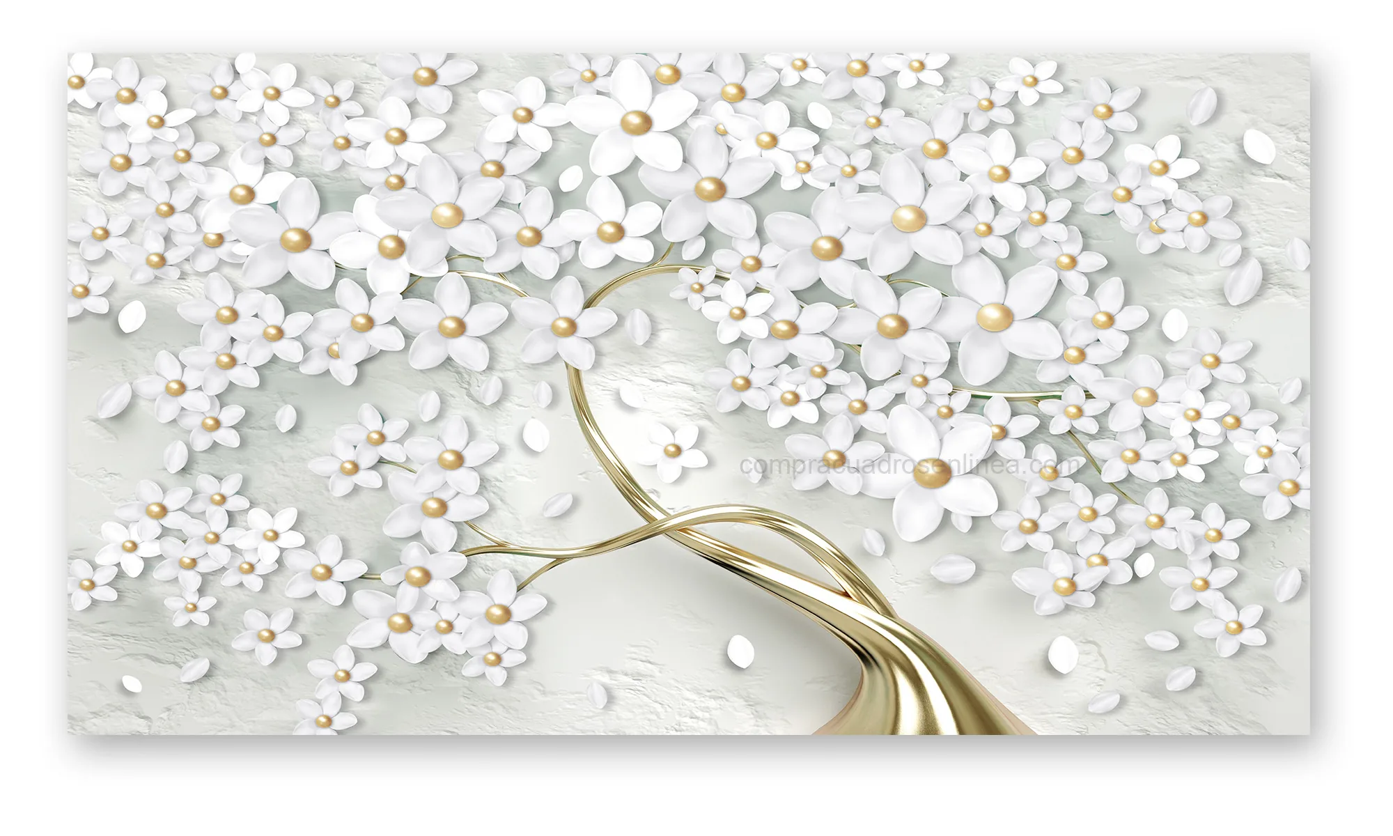Cuadro Árbol Floral Blanco y Dorado, Un diseño elegante de flores blancas con detalles dorados, perfecto para aportar luz y sofisticación a tus espacios. Ideal para sala, comedor o habitación. Su estilo aporta un punto focal elegante sin recargar el ambiente.