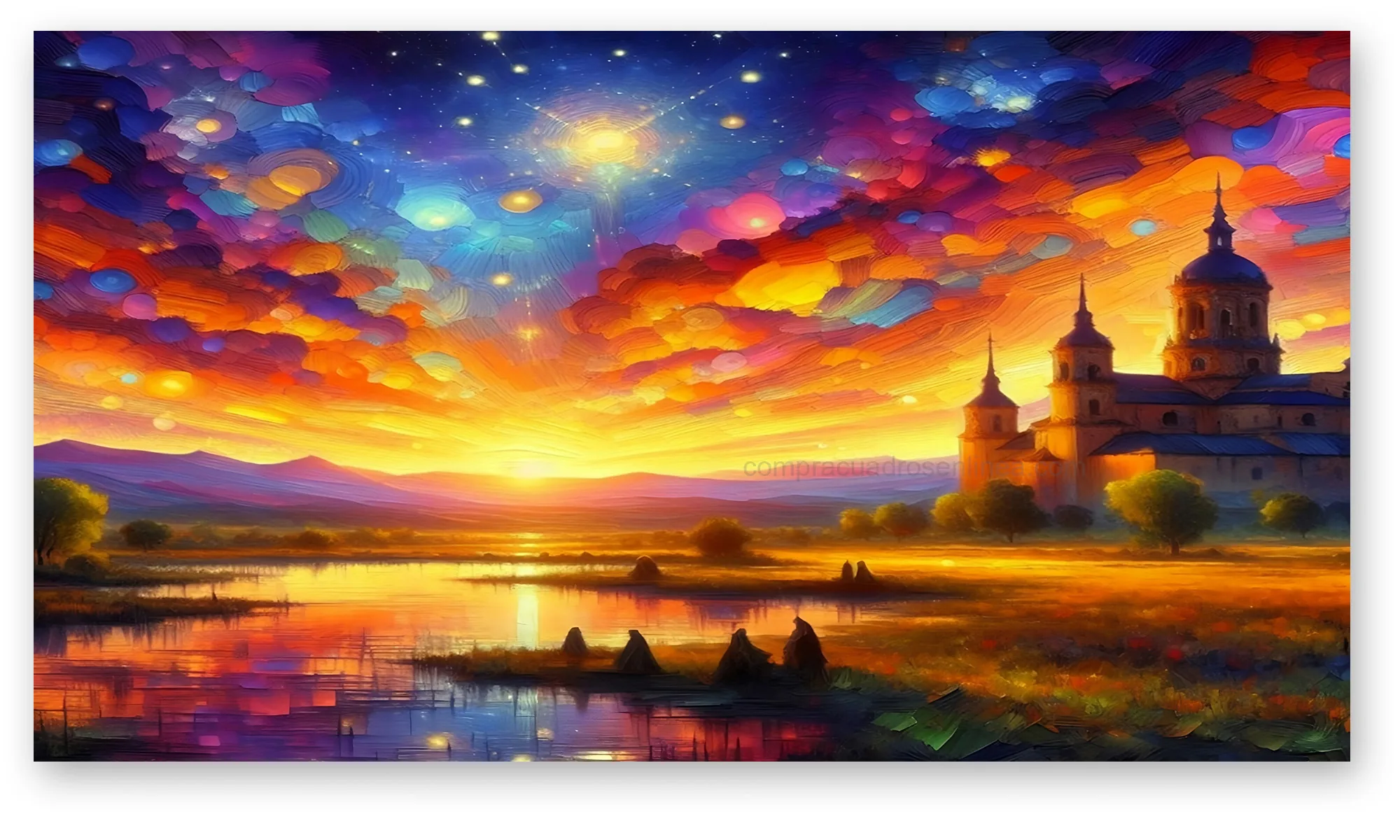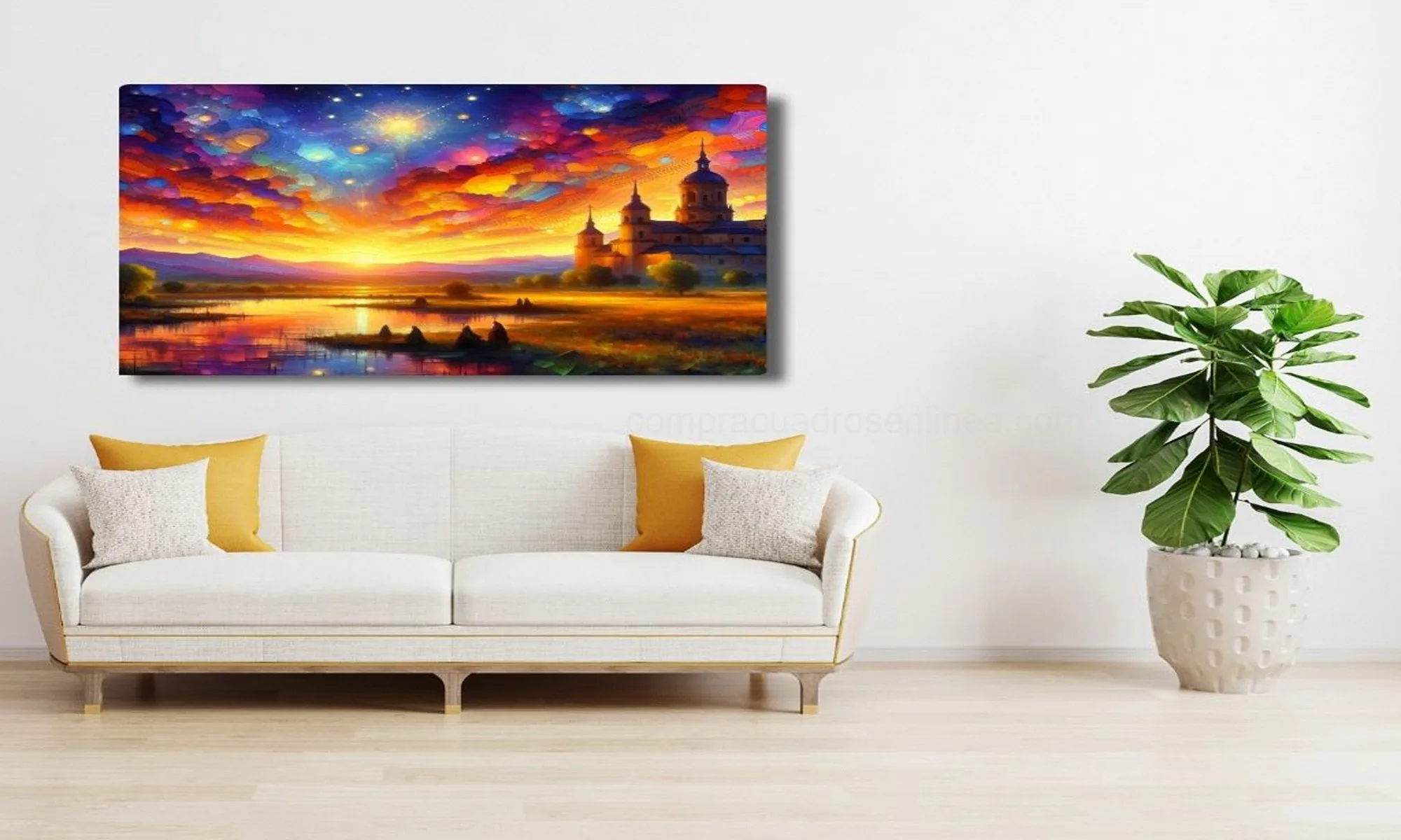 Cuadro atardecer dorado junto a la catedral, una escena cálida y artística que eleva la decoración de sala, comedor o habitación. El contraste de luz y arquitectura crea personalidad y un toque elegante.