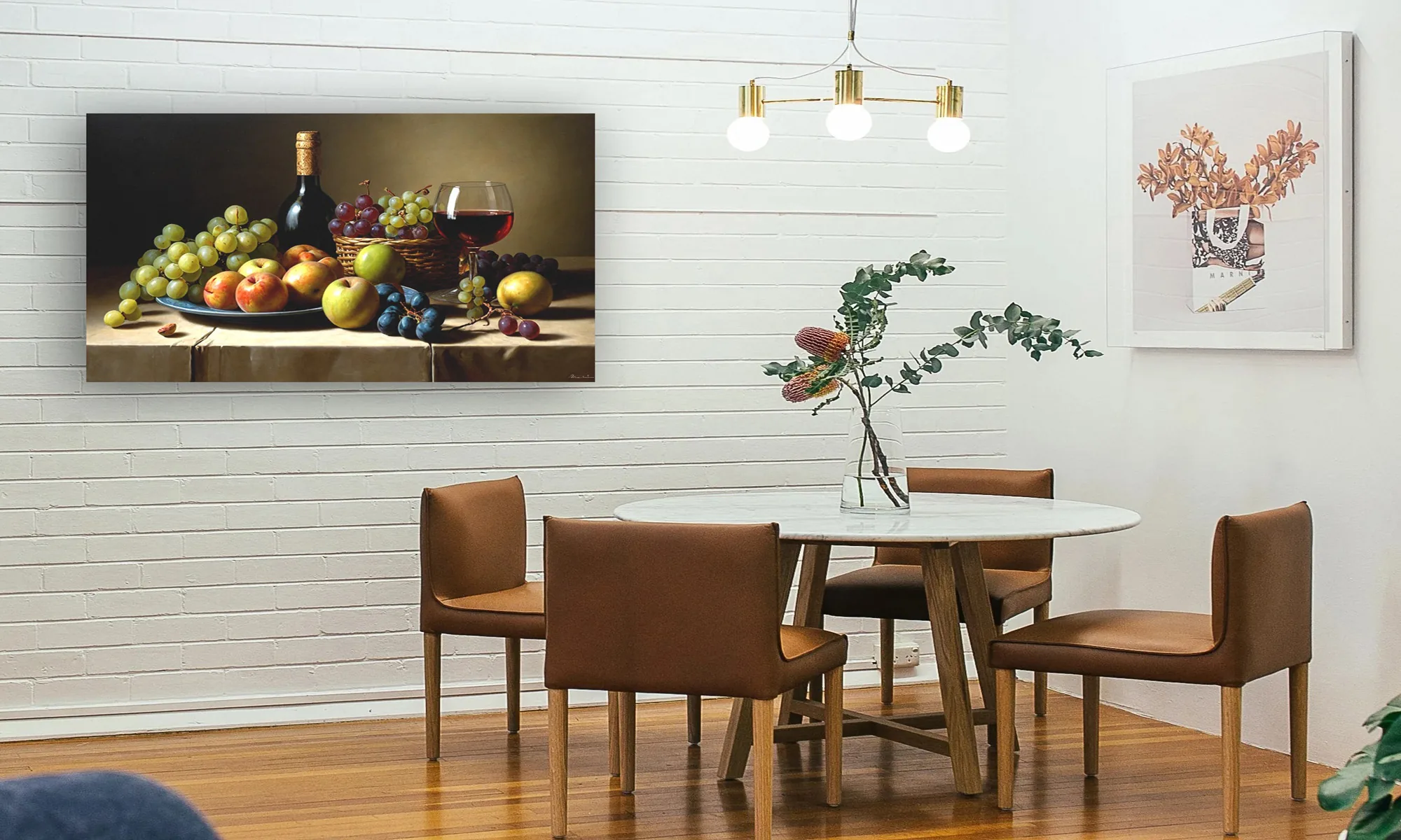 Bodegón clásico con uvas, manzanas y copa de vino, ideal para dar un toque elegante y atemporal a espacios como comedor o sala. Sus luces cálidas y detalles realistas crean una atmósfera acogedora.