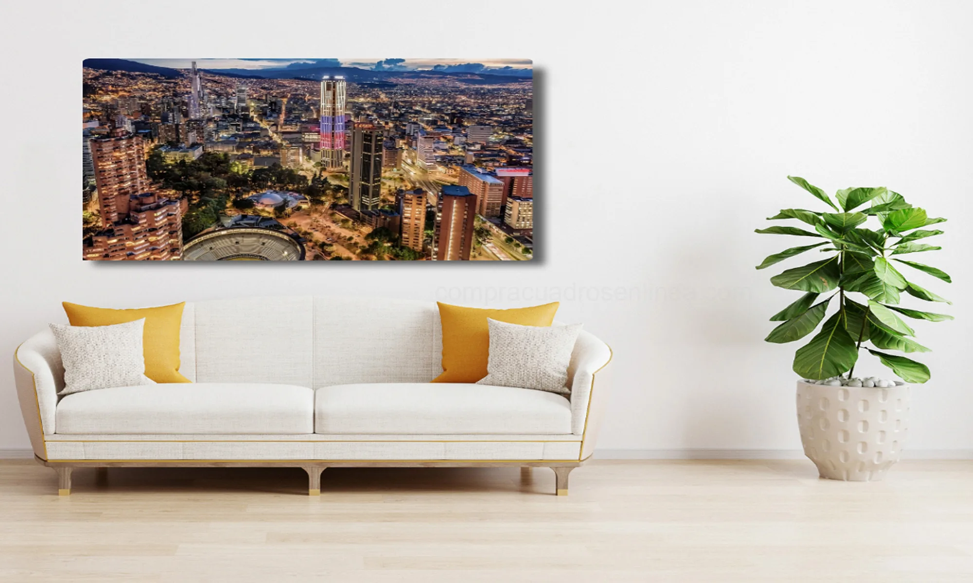 Bogotá nocturna panorámica con luces de ciudad en lienzo, ideal para sala, estudio u oficina. Listo para colgar.