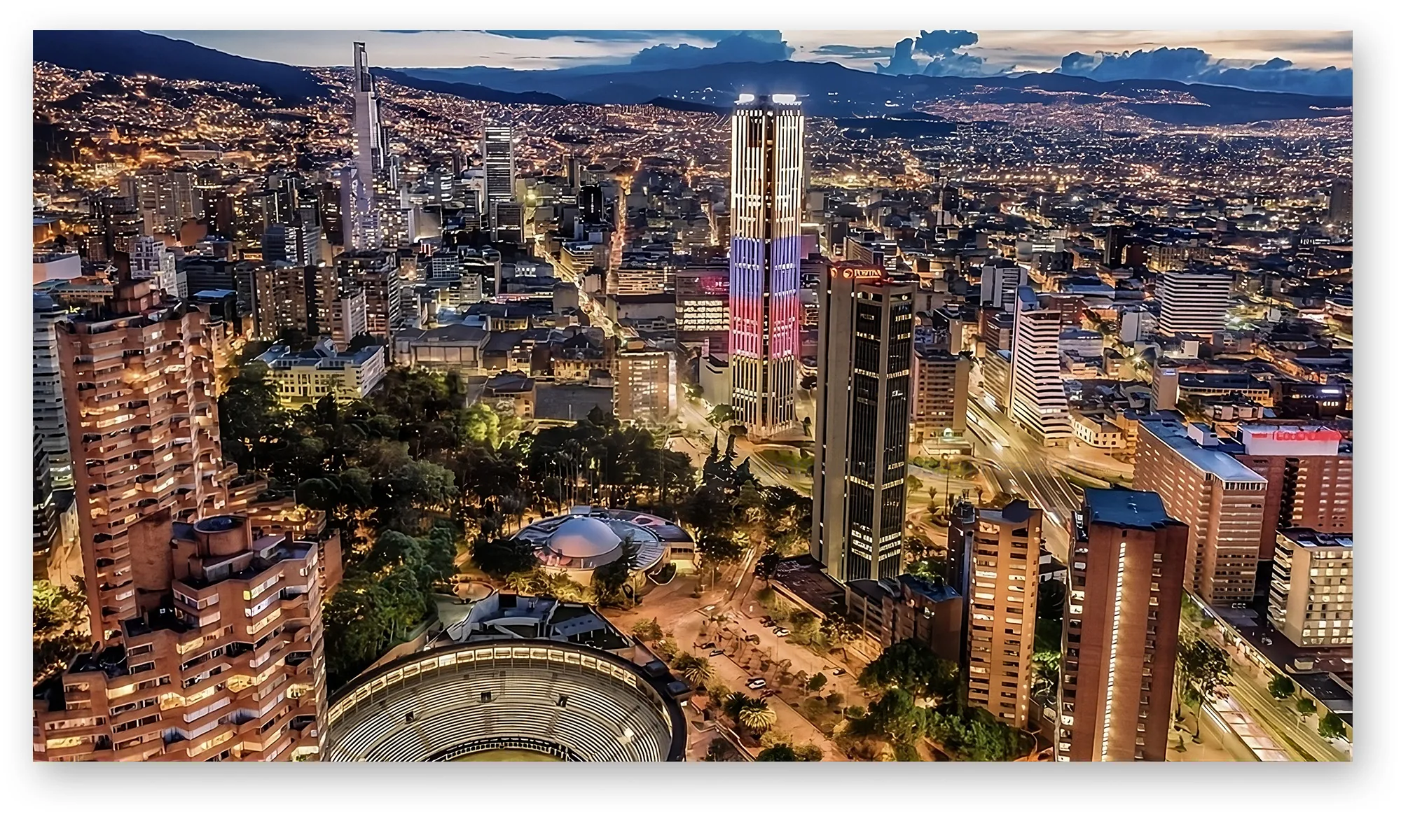 Bogotá nocturna panorámica con luces de ciudad y ambiente urbano elegante, ideal para aportar carácter y sofisticación a espacios como sala, estudio u oficina.