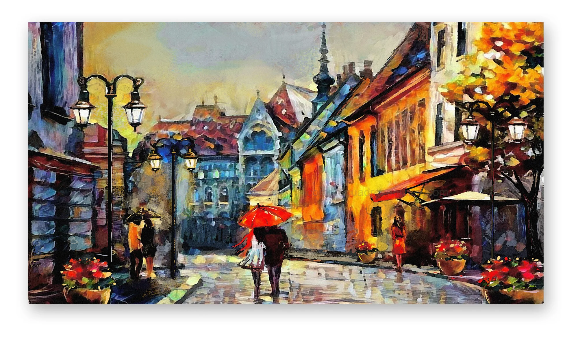 Cuadro Calle Europea Acuarela con Paraguas Rojo