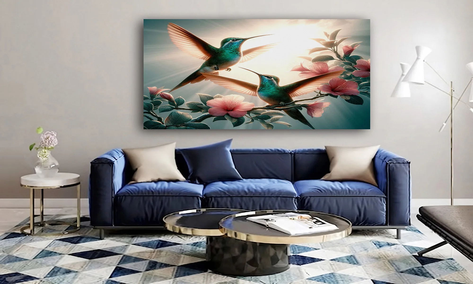 Colibríes en vuelo entre flores en tonos suaves, ideal para aportar frescura, delicadeza y un toque natural a sala, comedor o habitación. La combinación de verdes y rosados crea una escena luminosa y elegante.