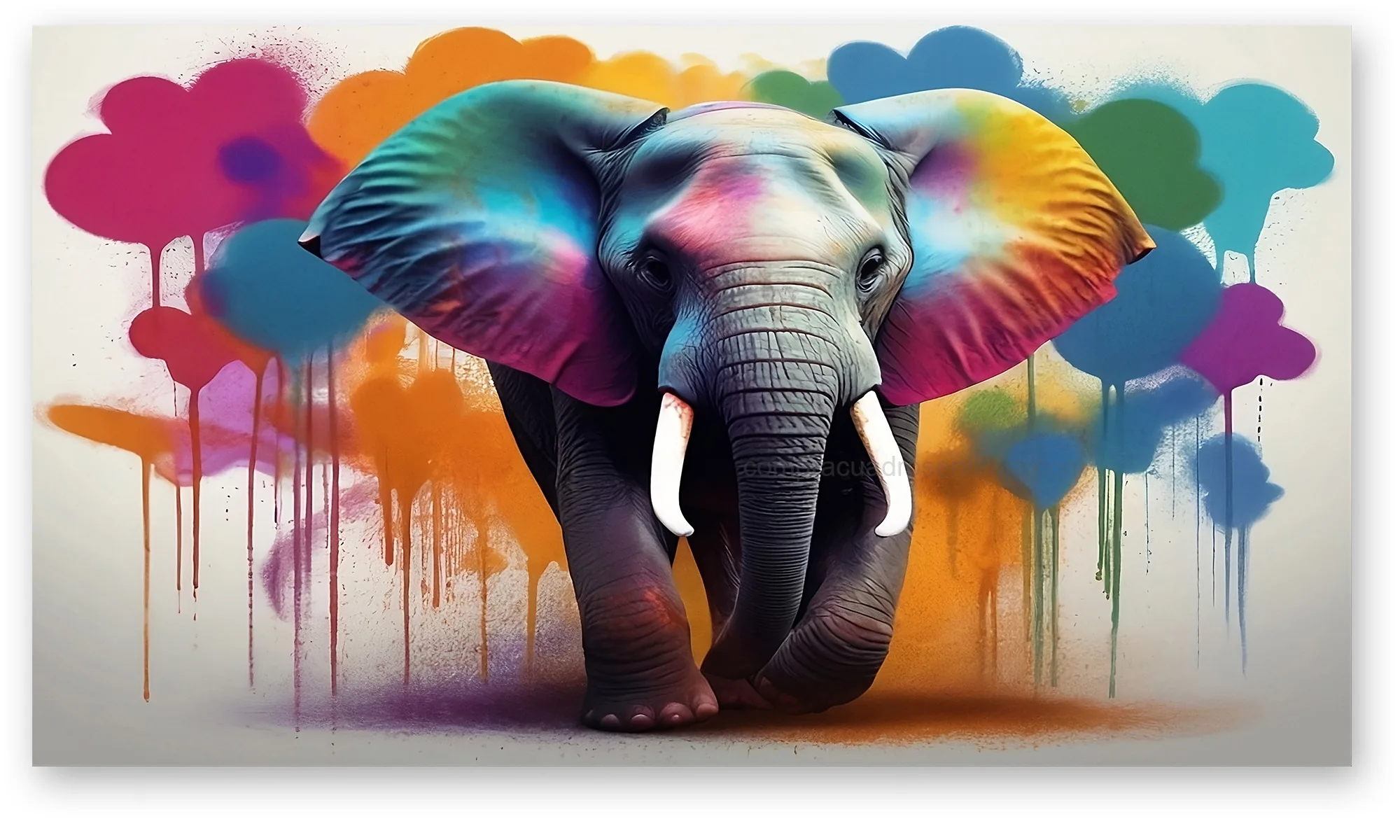 Elefante Urbano Multicolor – Arte Moderno en Lienzo. Una pieza decorativa llena de carácter, ideal para sala, comedor o habitación. Impresión sobre lienzo artístico en poliéster de alta calidad, montado en bastidor de madera de 3 cm, listo para colgar.