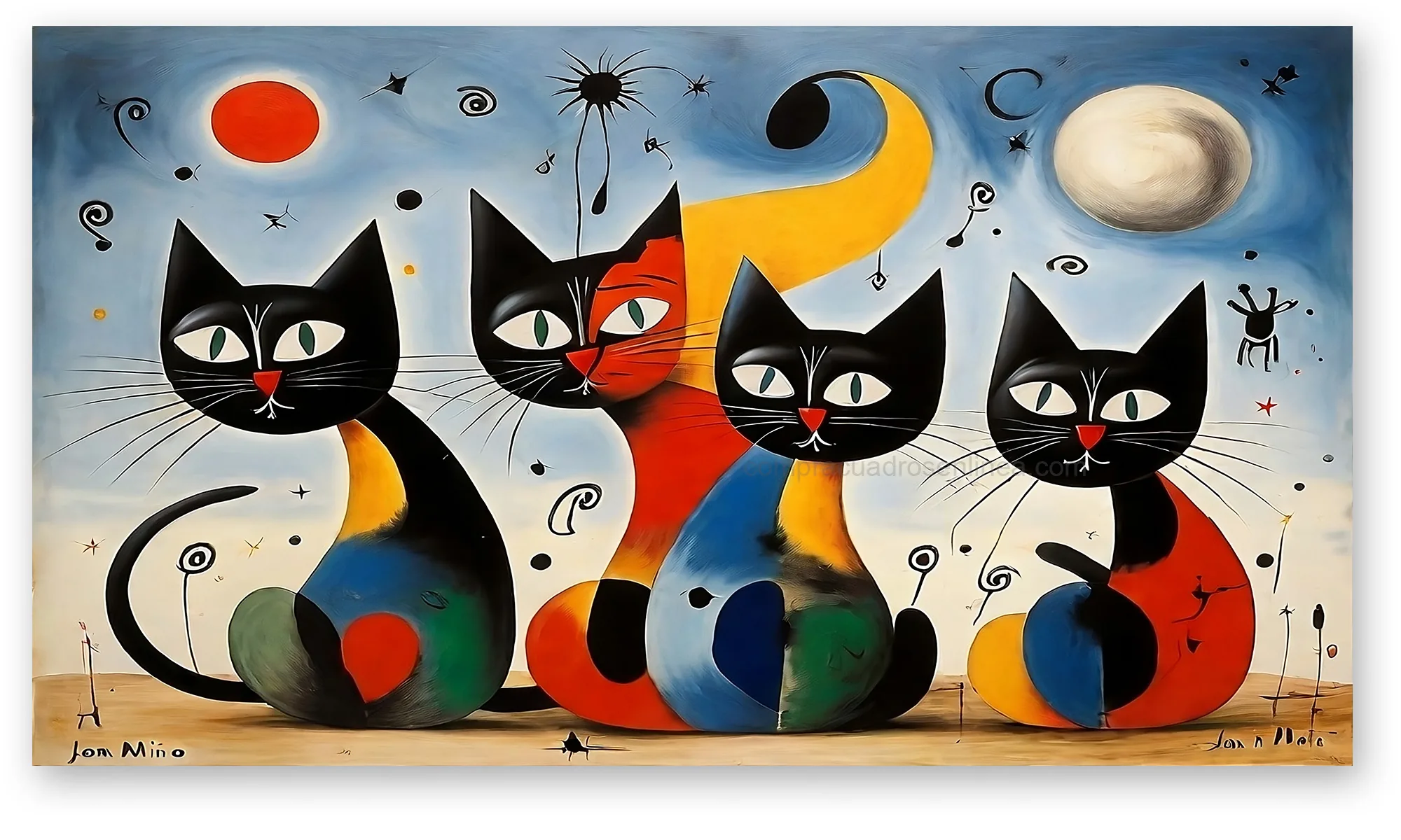 Cuadro Gato estilo Joan Miró arte moderno, una pieza moderna y divertida ideal para sala, comedor o habitación. Su estilo artístico inspirado en formas simples y colores vibrantes aporta un toque creativo y original a cualquier espacio.