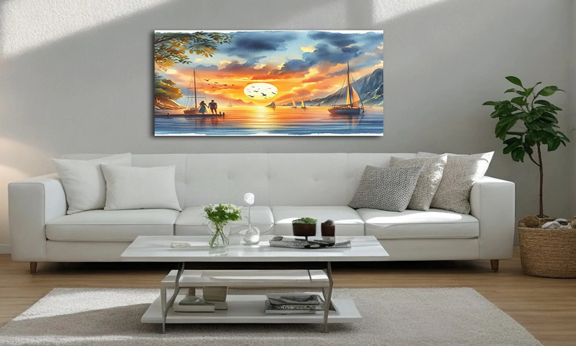 Cuadro Horizonte de amor con veleros al atardecer, un paisaje romántico y sereno que aporta calidez y elegancia a sala, comedor o habitación. Su luz suave crea un punto focal sofisticado sin recargar el ambiente.